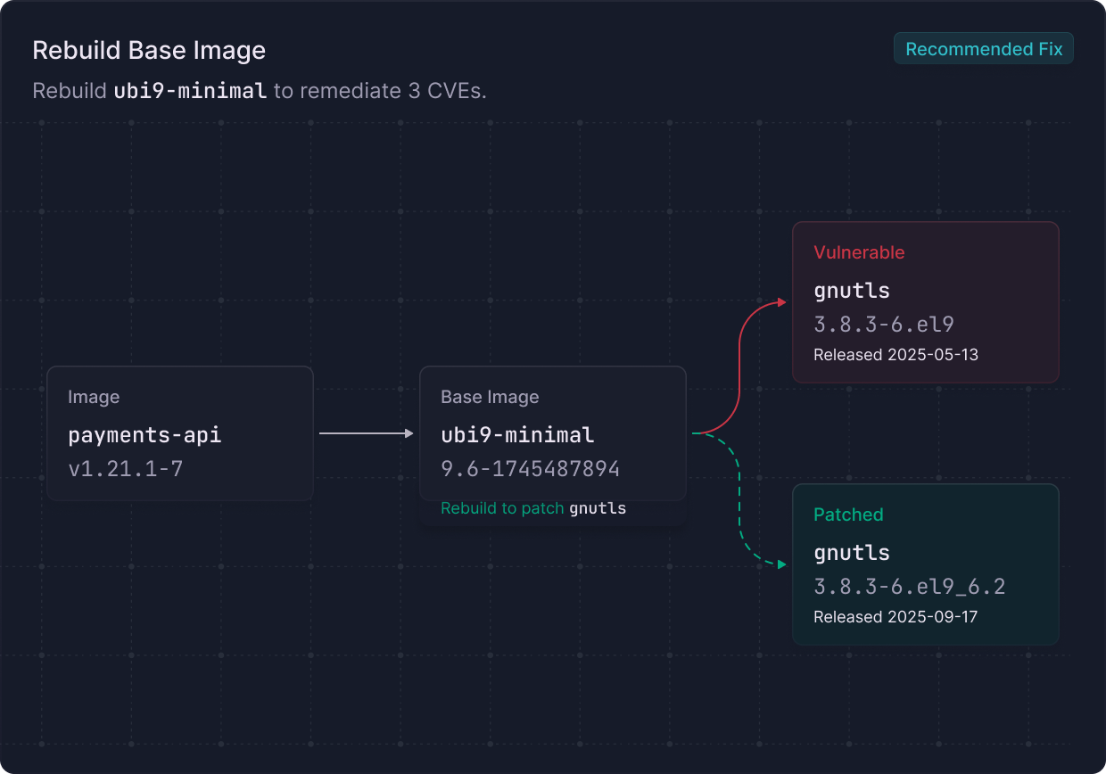 Rebuild the container image. Red Hat has already patched gnutls in their UBI 9 repositories. A fresh build pulls the fix automatically. No code changes. The agents verify this by checking that the rebuilt image includes gnutls-3.8.3-6.el9_6.2 or newer. Music to a developer's ears.