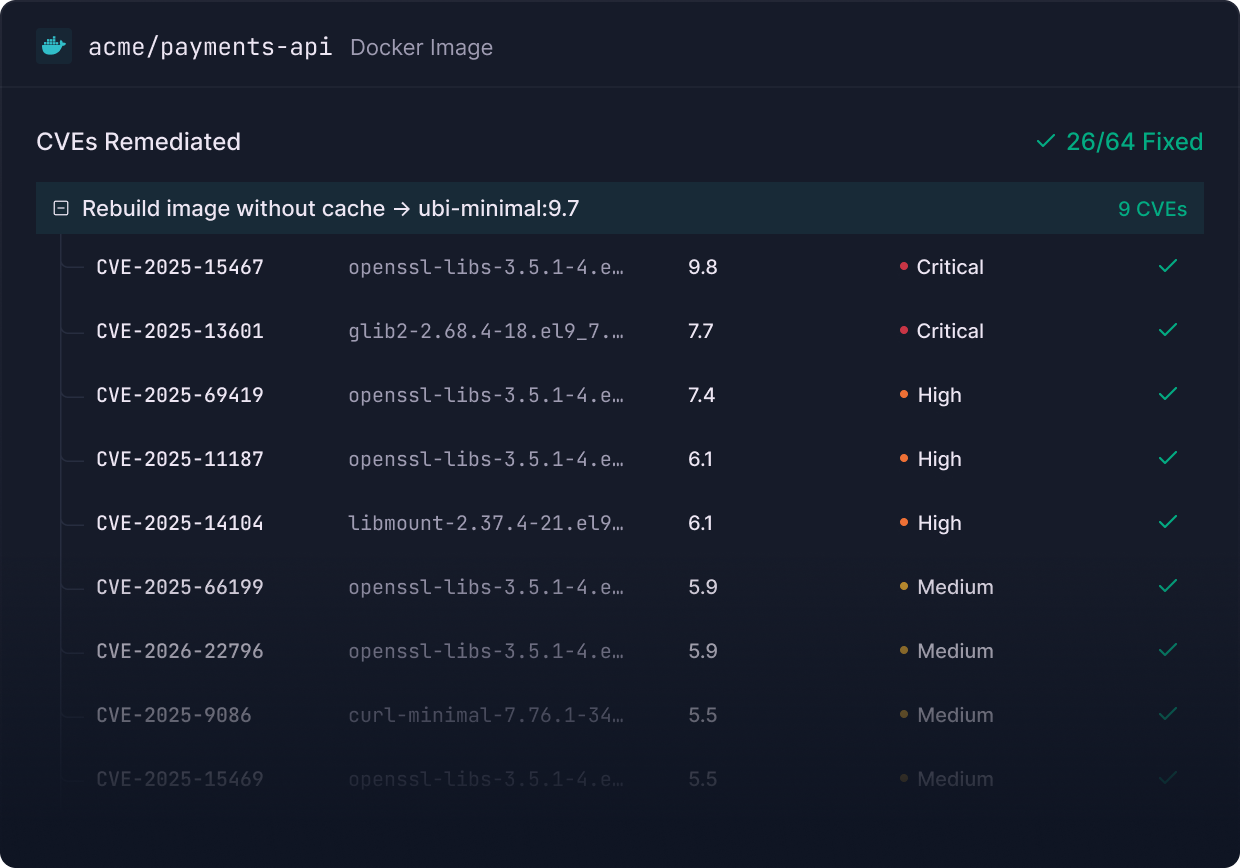 Before suggesting a fix, our agents confirm it actually resolves the vulnerability and flag if it introduces new ones. When we say "rebuild the image and the vulnerability is gone," we've already checked the patched image to make sure.